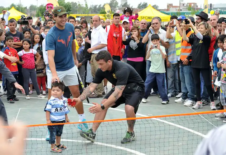 En uno de los tantos playones de cemento, el mallorquín peló la raqueta y hasta peloteó con Macri que se vistió de blanco como una novia para la ocasión, demostrando que este deporte no le es nada favorable. Los alumnos de la escuela de Batata Clerc y pibes de las distintas villas vecinas, se dieron cita para ver a un verdadero ídolo.