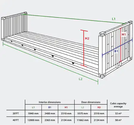 Si bien hay ocho tipos distintos, los containers estándar son los Dry Van, herméticos y sin ventilación. Las medidas varían dentro de un cierto rango pero se fijan en un ancho de 2.5 metros, una altura variable entre 2.4 y 2.9 metros y un largo de 2.5 a 16 metros. Los más usados en el mundo son los de una longitud entre 6 y 12 metros.