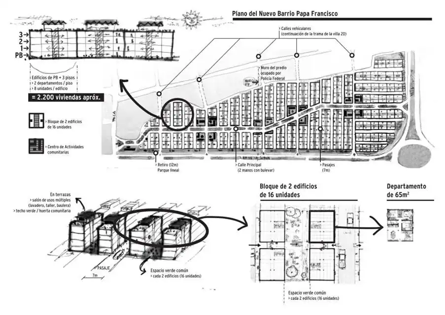 El proyecto presentado por los delegados fue elaborado con el asesoramiento de un equipo dirigido por la arquitecta Beatriz Pedro. Prevé “construcciones de planta baja y tres plantas, con dos departamentos por planta, a lo largo de todo el predio baldío ubicado sobre Fernández de la Cruz, entre la avenida Escalada y Pola”. Un sector de ese predio está ocupado por habitantes de la villa y otro sigue en poder de la Policía Federal.