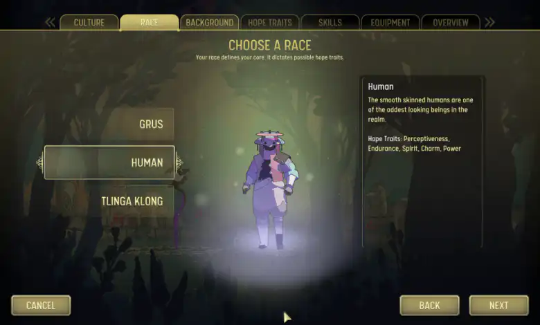 Antes que nada, debemos crear nuestro personaje. Primero hay que elegir su raza: humano, grus o tlinga Kong, luego su clase (todavía no están todas las opciones disponibles), después cuatro rasgos (que dependerán en parte de la raza) y, por último, sus habilidades. Claro que no debemos encariñarnos con porque tarde o temprano morirá. Es por eso que Unexplored 2 nos da la posibilidad de generar estos personajes de manera aleatoria.