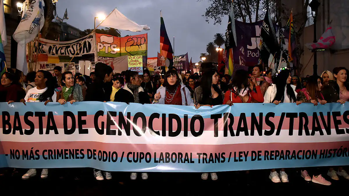 Distintas agrupaciones feministas marcharon ayer a las 16 frente al Ministerio de Géneros, Mujeres y Diversidad, en reclamo por el freno de los travesticidios, los transhomicidios y de los transfemicidios, en el marco del Día Internacional de la Lucha del Colectivo LGTBIQ+.