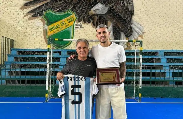 Luego de su conquista en Qatar 2022, el ex futbolista de Boca pasó a saludar a la gente del club Brisas del Sud. Allí se reencontró con el Tano Narnia y recibió una placa en conmemoración. «Gracias por vestir nuestros colores con tanta pasión y esfuerzo. Felicitaciones, campeón del mundo. De tus amigos de Brisas del Sud», afirma la distinción que recibió Paredes.