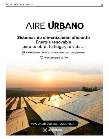 NOTICIARIO SUR • ABRIL 2025 29 Sistemas de climatización eficiente Energía renovable para tu obra, tu hogar, tu vida… Victor Hugo 1654 - (1408CZF) CABA | Calle 83 n 270 - (7630) Necochea 11 4992 3575 | 2262 50 4998 www.aireurbano.com.ar aireurbano