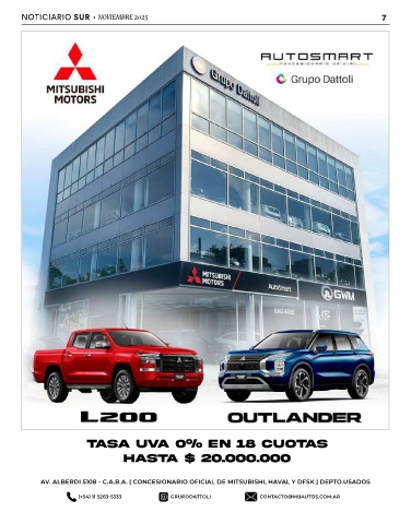 NOTICIARIO SUR • NOVIEMBRE 2025 7 TASA UVA 0% EN 18 CUOTAS HASTA $ 20.000.000 AV. ALBERDI 5108 - C.A.B.A. | CONCESIONARIO OFICIAL DE MITSUBISHI, HAVAL Y DFSK | DEPTO.USADOS (+54) 11 5263-5333 GRUPODATTOLI CONTACTO@MBAUTOS.COM.AR